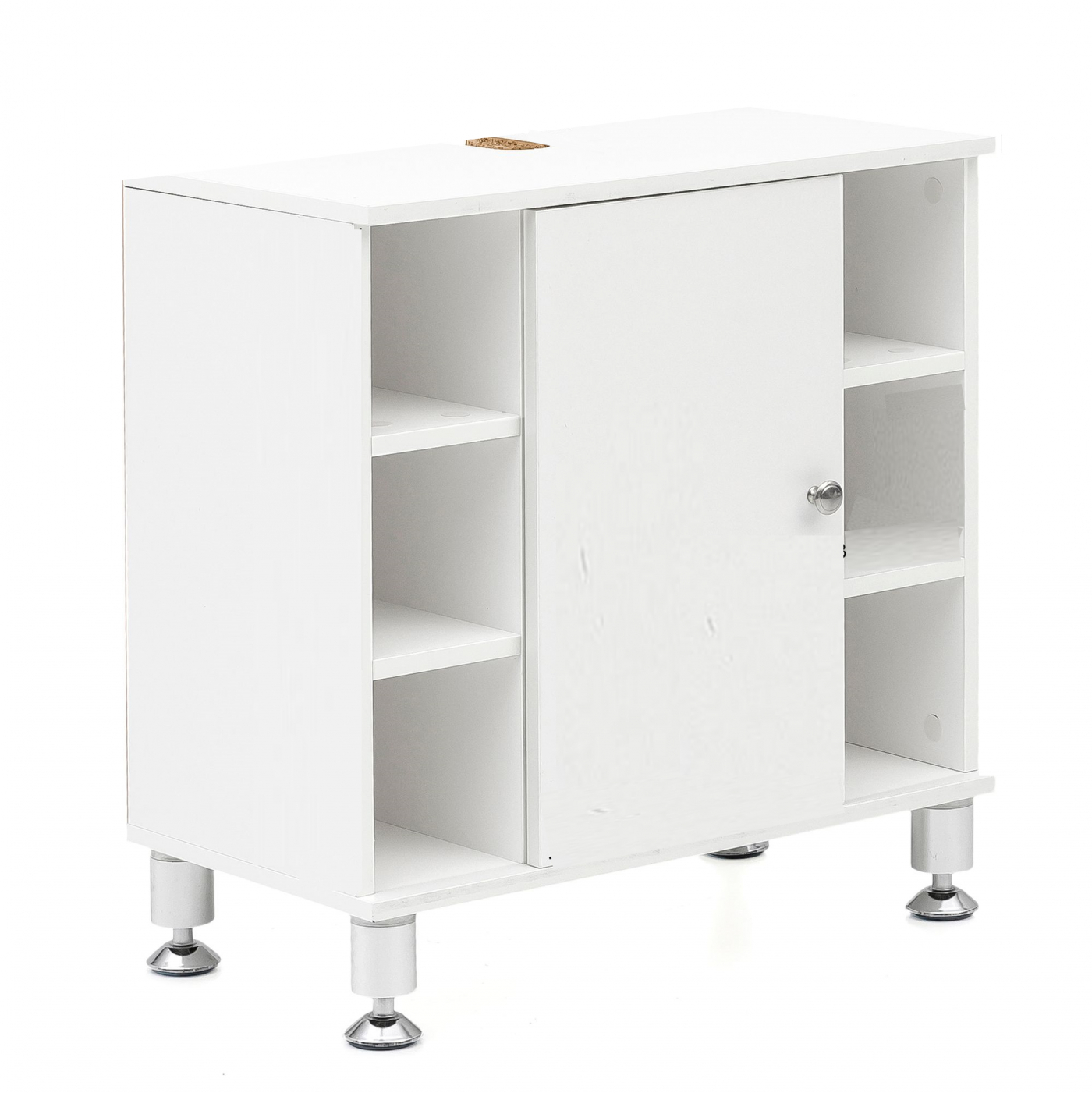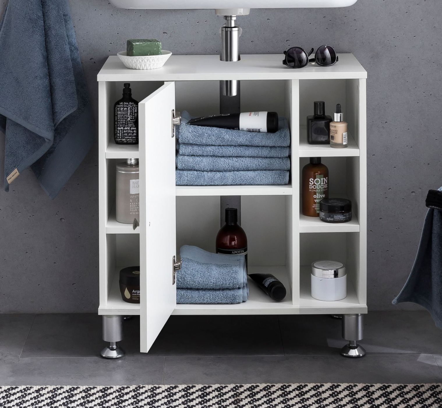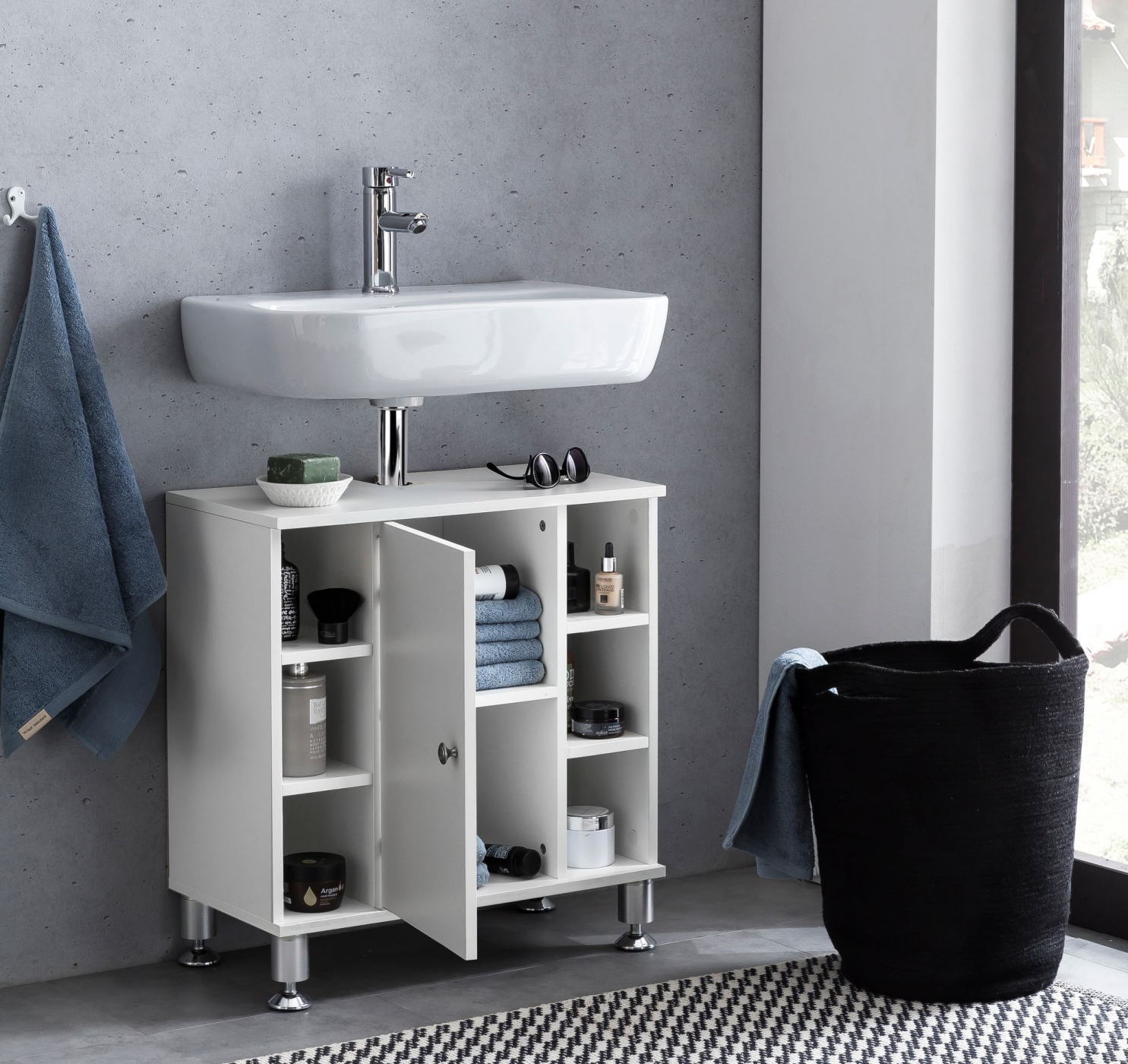 Dieser Unterschrank für unter dem Waschbecken ist ideal für jedes Badezimmer. Die Möbel sind platzsparend und bieten genügend Ablagemöglichkeiten, damit Ihr Badezimmer ordentlich bleibt. Die vier Beine bieten die richtige Stabilität. Die Melaminoberfläche sorgt dafür, dass sich diese Badmöbel sehr leicht reinigen lassen und unempfindlich gegen Feuchtigkeit sind. Das Mobiliar verfügt über 4 kleine offene Ablagefächer, 2 vorne und 2 seitlich und 2 große Ablagefächer mit 1 Fachboden, der mit einer Tür verschlossen werden kann. Farbe: Weiß Maße: hoch 50 cm, breit 60 cm, tief 29 cm. Lieferung inklusive Handbuch und erforderlichem Montagematerial.
