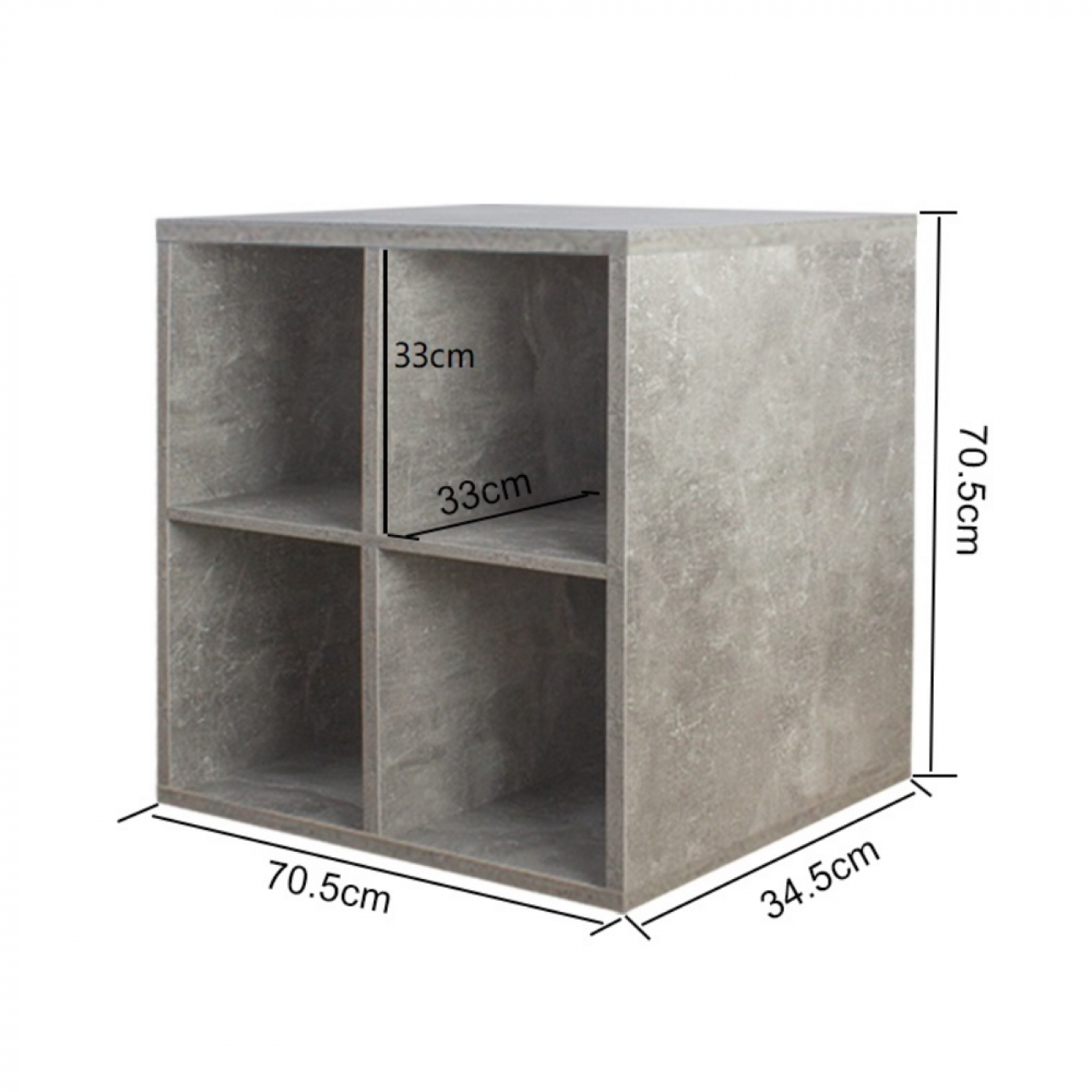 Ein robuster und schlichter, aber multifunktionaler, betonfarbener Fächerschrank mit 4 offenen Fächern zum Aufbewahren und Präsentieren von beispielsweise Sammlungen oder Büchern, aber auch anderen Wohnaccessoires. Dieser Wandschrank mit offenen Fächern hat Regale, wodurch 4 Fächer entstehen. Natürlich ist dieser Aufbewahrungsschrank auch universell in Ihrem Büro, Arbeits-, Schlaf- oder Wohnzimmer einsetzbar. Die Lieferung erfolgt in Einzelteilen inkl. Montageanleitung und Montagematerial. Die Außenmaße dieses Möbels sind: Höhe 70,5 cm x Breite 70,5 cm x Tiefe 34,5 cm.