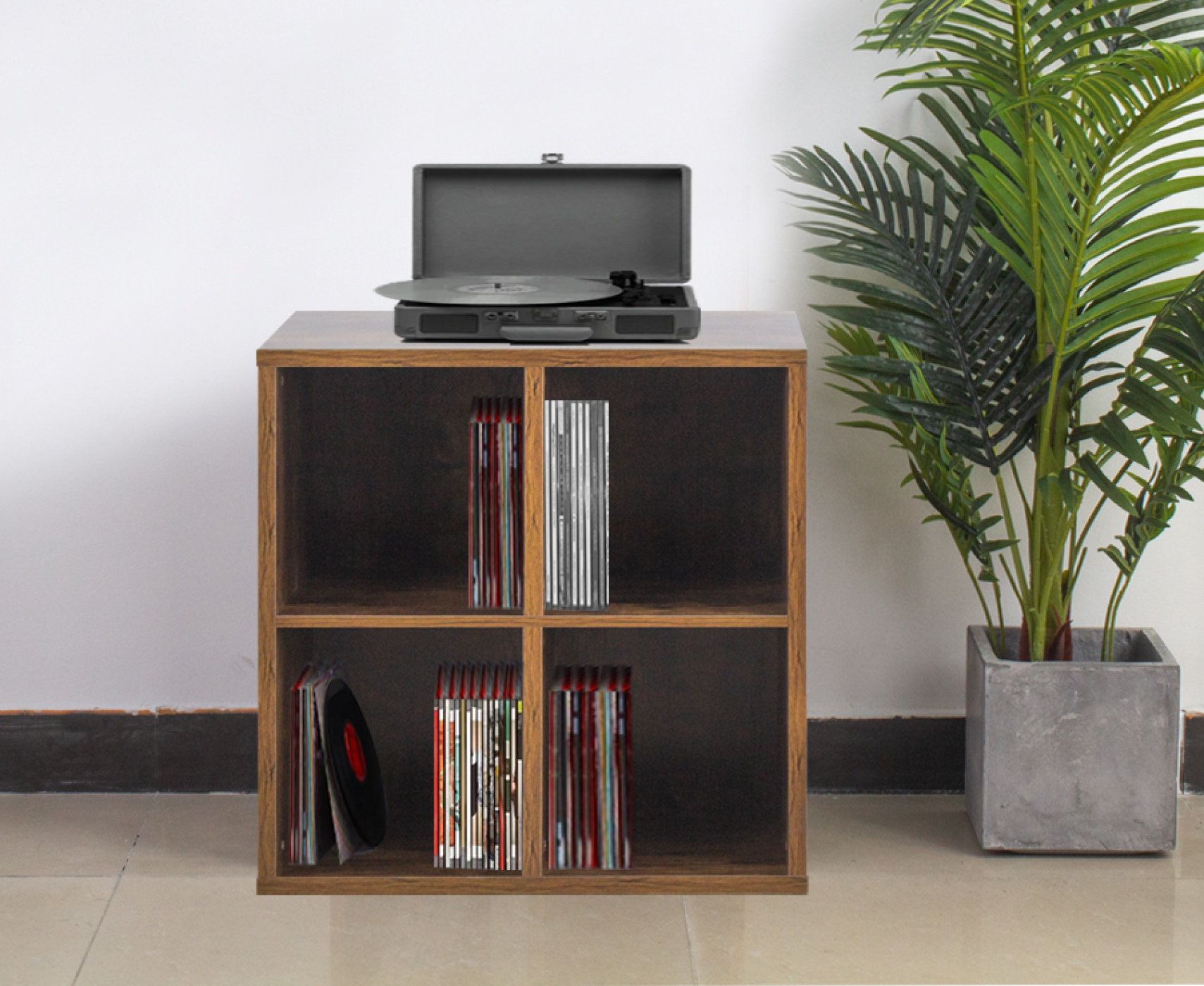 Ein robuster und schlichter, aber multifunktionaler nussbaumfarbener Fächerschrank mit 4 offenen Fächern zur Aufbewahrung und Präsentation von z.B. Sammlungen oder Büchern, aber auch von anderen Wohnaccessoires. Dieses offene Regal hat Einlegeböden, die 4 Fächer bilden. Natürlich kann dieses Regal auch universell in Ihrem Büro, Arbeitszimmer, Schlafzimmer oder Wohnzimmer eingesetzt werden. Die Lieferung erfolgt in Teilen inkl. Montageanleitung und Befestigungsmaterial. Die Außenmaße dieses Möbelstücks sind: Höhe 70,5 cm x Breite 70,5 cm x Tiefe 34,5 cm.