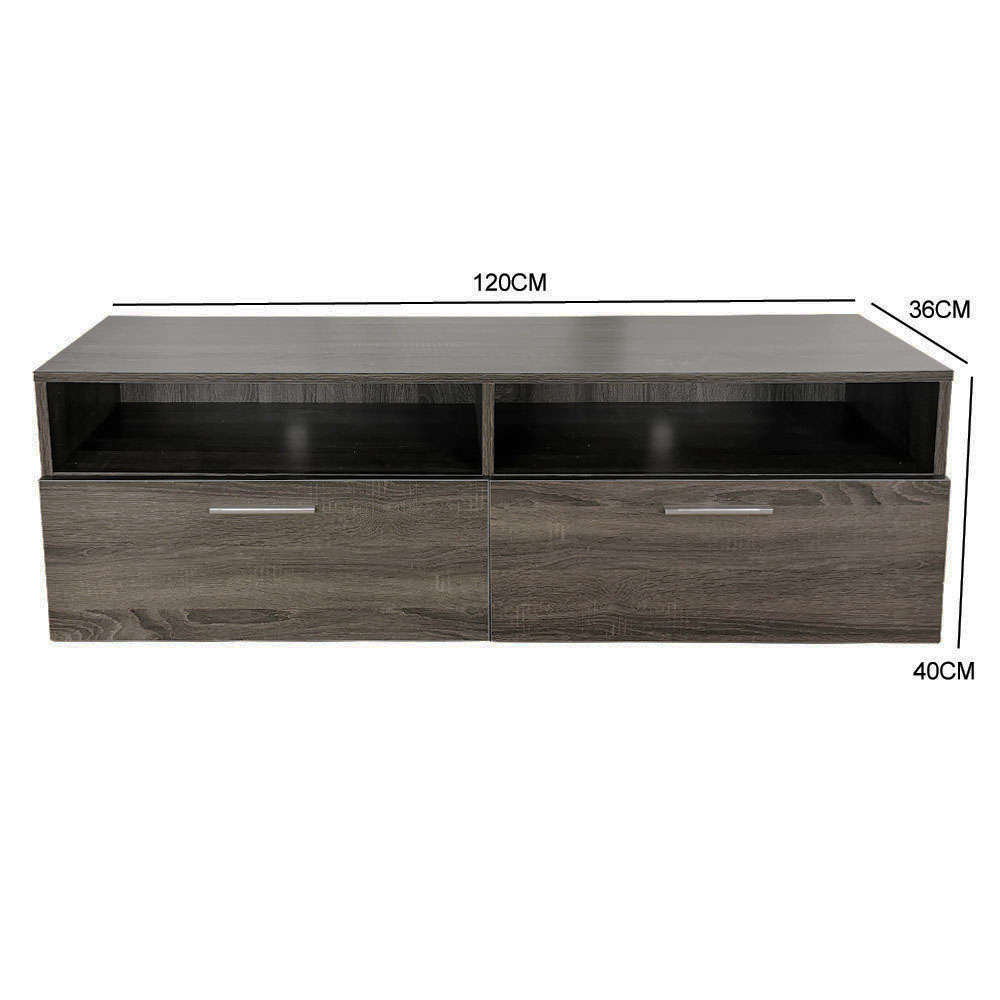 Dieser einfache, aber elegante und praktische 120 cm breite braun-graue TV-Schrank hat ein modernes Design. Dieser TV-Schrank ist ideal für das Wohnzimmer, (Kinder-) Schlafzimmer oder Spielzimmer. In den beiden offenen Fächern unter der obersten Stelle können Sie die Playstation Nintendo oder andere Spielgeräte, aber auch Ihre Audiogeräte oder anderes Zubehör platzieren. Geräte oder Gegenstände, die nicht sichtbar sein sollen, können hinter den beiden Klappentüren außer Sichtweite aufbewahrt werden. Farbe: braun grau gefärbt. Abmessungen: breit 120 cm hoch 40 cm tief 36 cm. Die Lieferung beinhaltet Montageanweisungen und notwendige Montagematerialien.