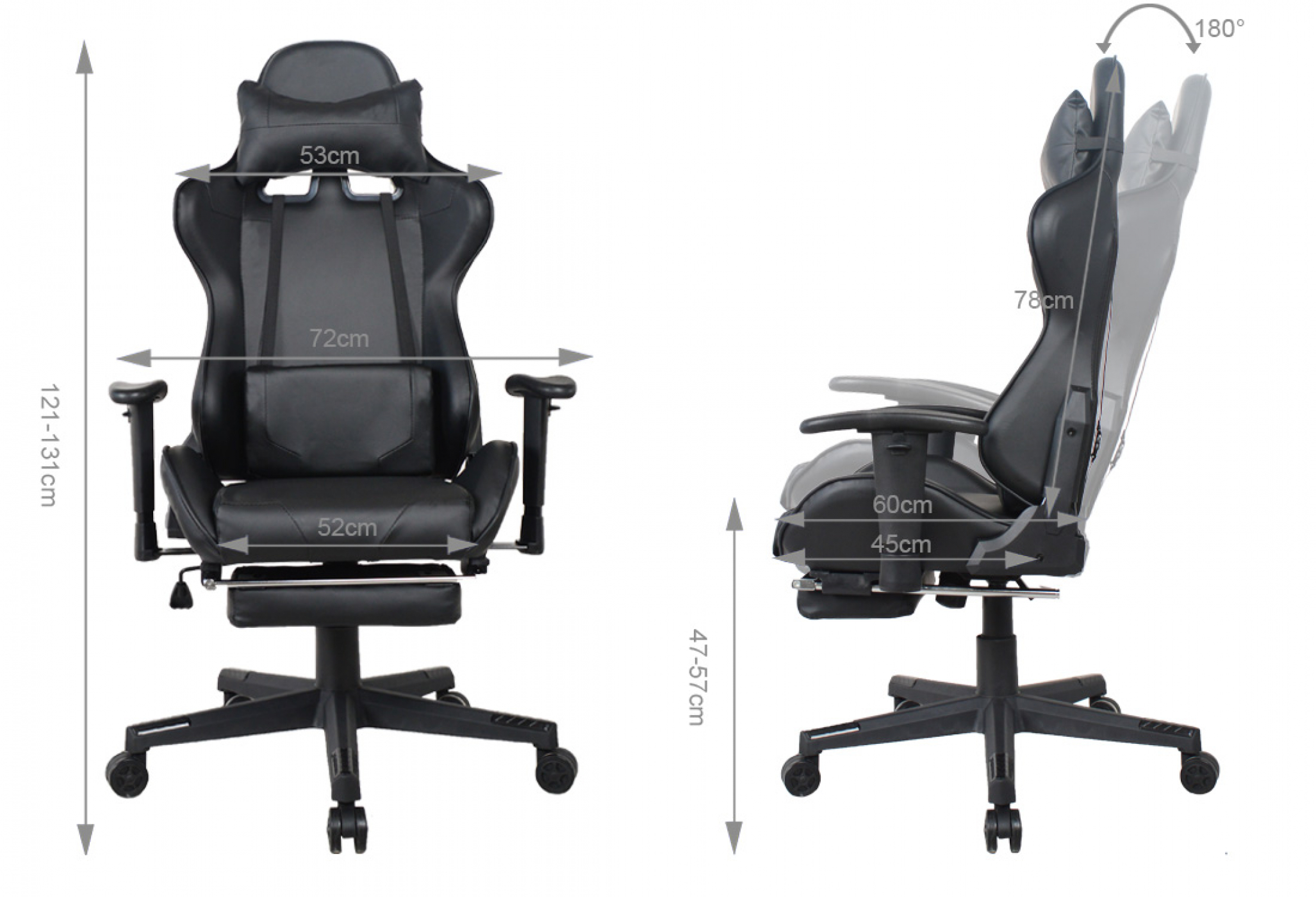 Dieser stabile, formschöne und stabile Multifunktions-Spielstuhl in Schwarz mit klappbarer und klappbarer Fußbank bietet viele Möglichkeiten, den Gaming-Rennstuhl an Ihre persönlichen Wünsche anzupassen. Hoher und bequemer Sitzkomfort, perfekt zum Gaming, aber auch beim Arbeiten, Lernen oder anderen Arbeiten am Schreibtisch. Hoher Sitzkomfort wird durch das dicke, hochwertige Schaumstofffutter der Polsterung, den breiten Schalensitz und die breite Rückenlehne sowie die Lordosenstütze mit extra herausnehmbarem Kopfkissen – Nackenkissen und einem separaten Lordosenstützkissen gewährleistet. Der Komfort dieses Gaming-Stuhls wurde um eine ergonomisch geformte, neigbare Rückenlehne (bezogen auf das Körpergewicht), ergonomische Schwenk- und höhenverstellbare 2D-Armlehnen erweitert. Eine hochwertige, verstellbare Rückenlehne der Klasse 3 mit Gasfeder, die um 180 Grad nach hinten geneigt werden kann. Mit dem klappbaren und klappbaren Fußhocker können Sie aufrecht am Schreibtisch arbeiten oder aus diesem Schreibtischstuhl einen Relax Lounge Chair für einen entspannten Ruhemoment beim Gaming, Arbeiten oder Lernen machen 120 cm bis 130 cm = Sitzhöhe von 48 cm bis 58 cm. Dieser Bürostuhl ist um 360 Grad drehbar und steht stabil auf einem stabilen Stahlgestell mit fünf Rollen. Ob harte oder weiche Oberfläche, dieser Gaming-Stuhl fährt sich immer leicht über die Oberfläche. Farbe schwarz. Stuhlmaße: hoch: 120 – 130 cm breit, 72 cm tief: 68 cm. Sitzhöhe: 48 – 58 cm. Sitztiefe: 45 cm. Sitzbreite 52cm. Rückenhöhe 78 cm. Maximale Tragfähigkeit: 125 kg. Lieferung inklusive Montageanleitung und notwendigem Montagematerial.