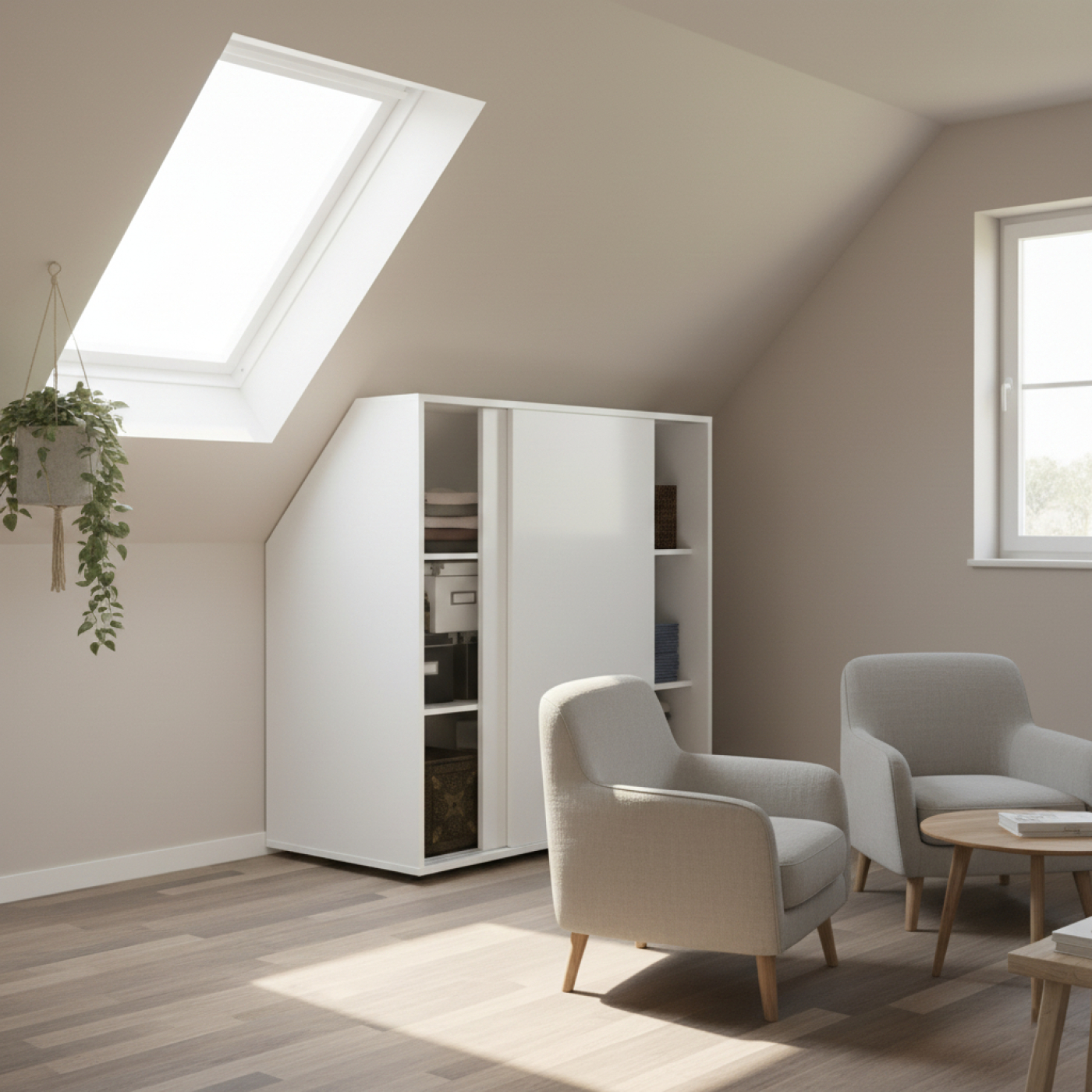 Platzsparender weißer Aufbewahrungsschrank für schräge Wände