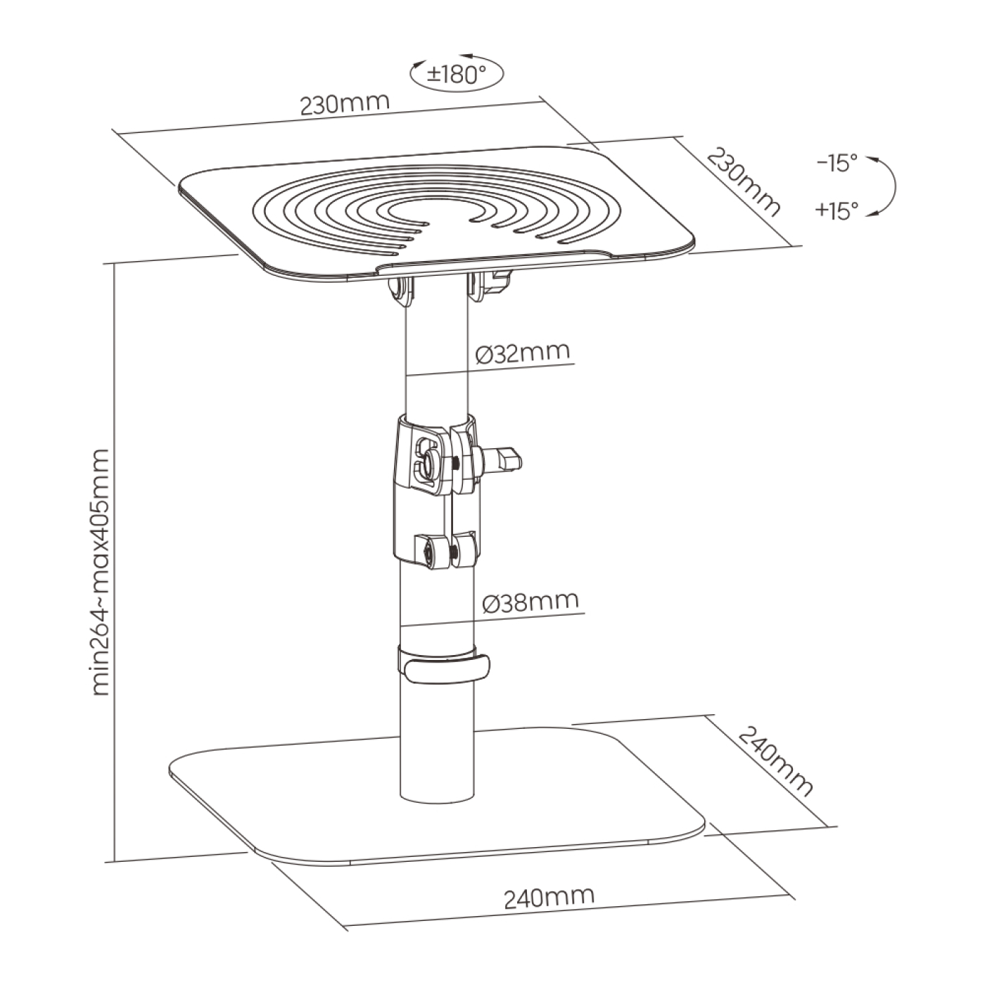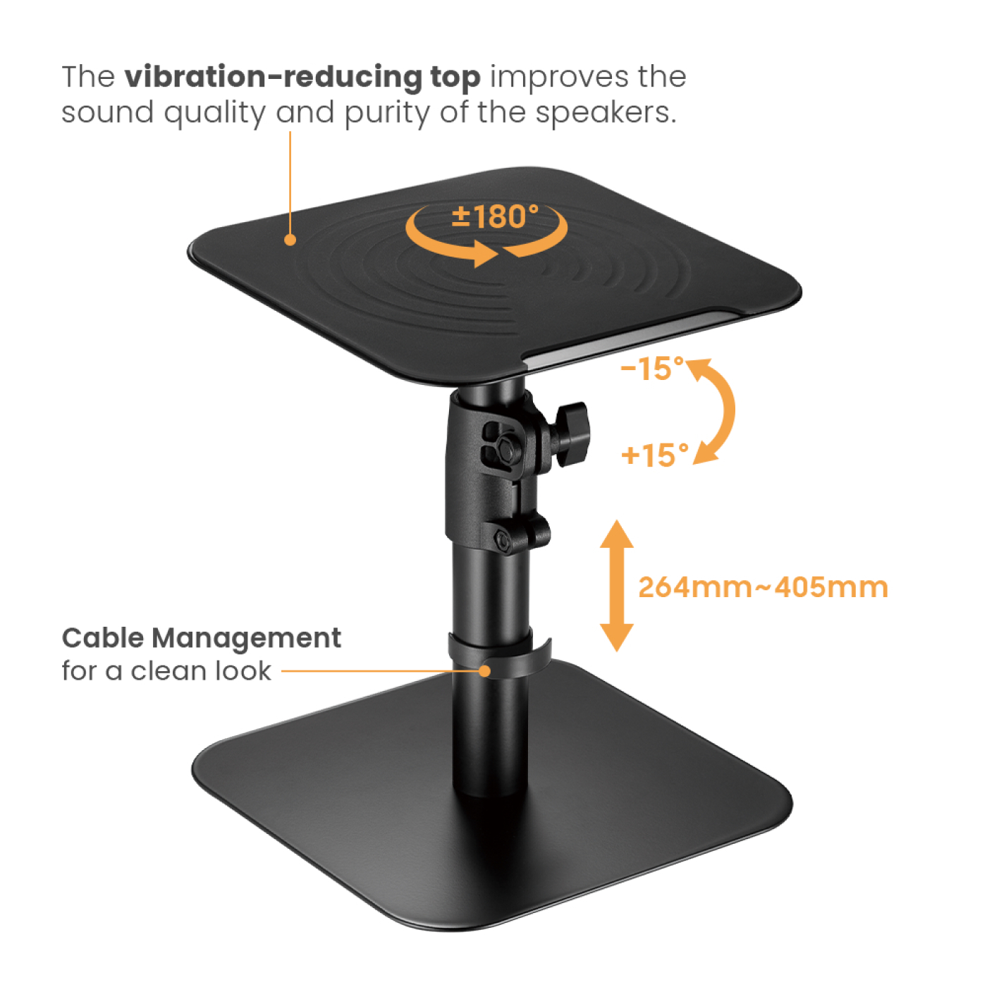 Ein Set aus zwei universellen Lautsprecherständern, die sich zum Aufstellen auf einem Schreibtisch oder anderen Möbeln oder Regalen in Ihrem Wohnzimmer, Schlafzimmer, Studio oder Büro eignen. Der Lautsprecherständer ist zwischen 26 cm und 40 cm höhenverstellbar und kann um 180 Grad gedreht und um 15 Grad nach oben und unten geneigt werden, für Ihren optimalen Hörwinkel und ein hochwertiges Musikerlebnis. Ein einzigartiges vibrationsdämpfendes Silikon-Top-Pad-Design verbessert die Qualität und Reinheit des Klangs, während der Lautsprecher fest auf dem Ständer steht. Das Kabelmanagement verbirgt Kabel für einen organisierten Look. Das maximale Gewicht pro Ständer beträgt 15 kg. Die Abmessungen dieses Lautsprecherständers betragen 23 cm x 23 cm x 26 cm bis 40 cm.
