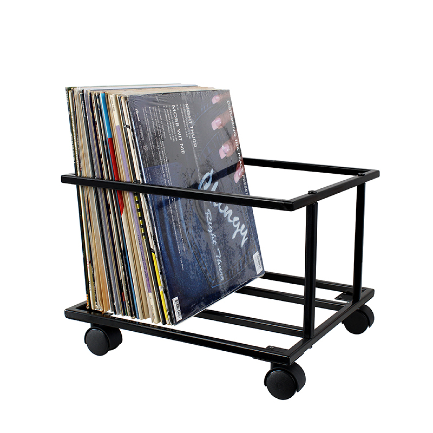 Ein praktischer und schöner mobiler Plattenwagen für ca. 75 12-Zoll-Schallplatten. Eine einfache Möglichkeit, Ihre Schallplattensammlung zu speichern und zu durchsuchen. Die Konstruktion aus schwarzem epoxidbeschichtetem Stahl verbindet Langlebigkeit mit elegantem Design. Abmessungen: Breite 35,5 cm x Tiefe 35,5 cm x Höhe 26 cm.