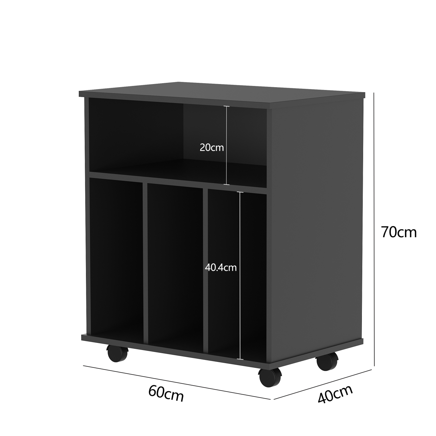 Schöner und praktischer schwarzer LP-Schallplattenschrank auf Rädern, in dem Sie im oberen Teil Ihren Plattenspieler oder andere elektronische Geräte unterbringen und in den unteren Fächern z.B. Ihre Schallplatten aufbewahren können. Natürlich kann dieser mobile Schrank auch als mobiler TV-Schrank verwendet werden oder eignet sich zur Aufbewahrung von Zeitschriften oder Büchern in Ihrem Wohnzimmer, Schlafzimmer oder Arbeitszimmer.