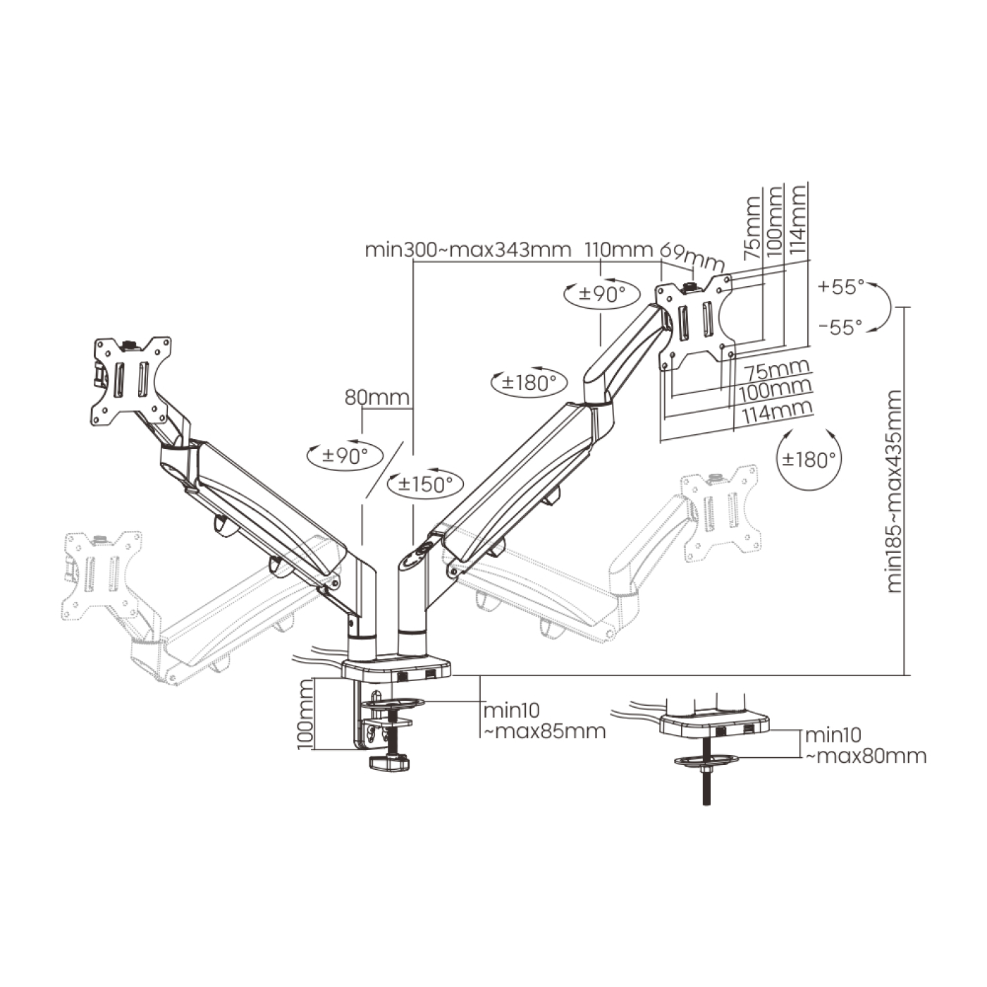 Monitorhalterung 2 bildschirme gasfeder – monitorarm – usb 3.0 und typ c – drehbar neigbar drehbar