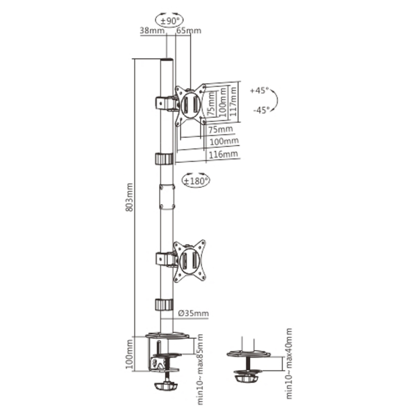 Eine Monitorhalterung zur Montage von 2 Bildschirmen übereinander. Die langlebige Stahlkonstruktion bietet diesem Monitorarm stabilen Halt für zwei Displays von 17 Zoll bis maximal 32 Zoll mit einem maximalen Gewicht von 9 kg pro Bildschirm Flexibles Design für große Anpassungs- und Betrachtungswinkel. Tüllen- und Klemmbefestigungsoptionen enthalten für die Installation auf praktisch jeder Arbeitsfläche. Eine abnehmbare VESA-Platte für eine einfache Installation. Inklusive Kabelclips für einen organisierten und aufgeräumten Arbeitsplatz. Der solide Gelenkmonitorarm mit 45 Grad Neigung, 90 Grad Schwenkung und 180 Grad Drehung trägt zu einer unvergleichlichen Ergonomie und Produktivität bei. Der Bildschirm kann sowohl horizontal als auch vertikal verwendet werden. Da die Bildschirme an der 80 cm hohen Stange stufenlos höhenverstellbar sind, haben Sie immer eine optimale ergonomische Position hinter dem Bildschirm. Vesa-kompatibel mit 75 x 75 und 100 x 100.