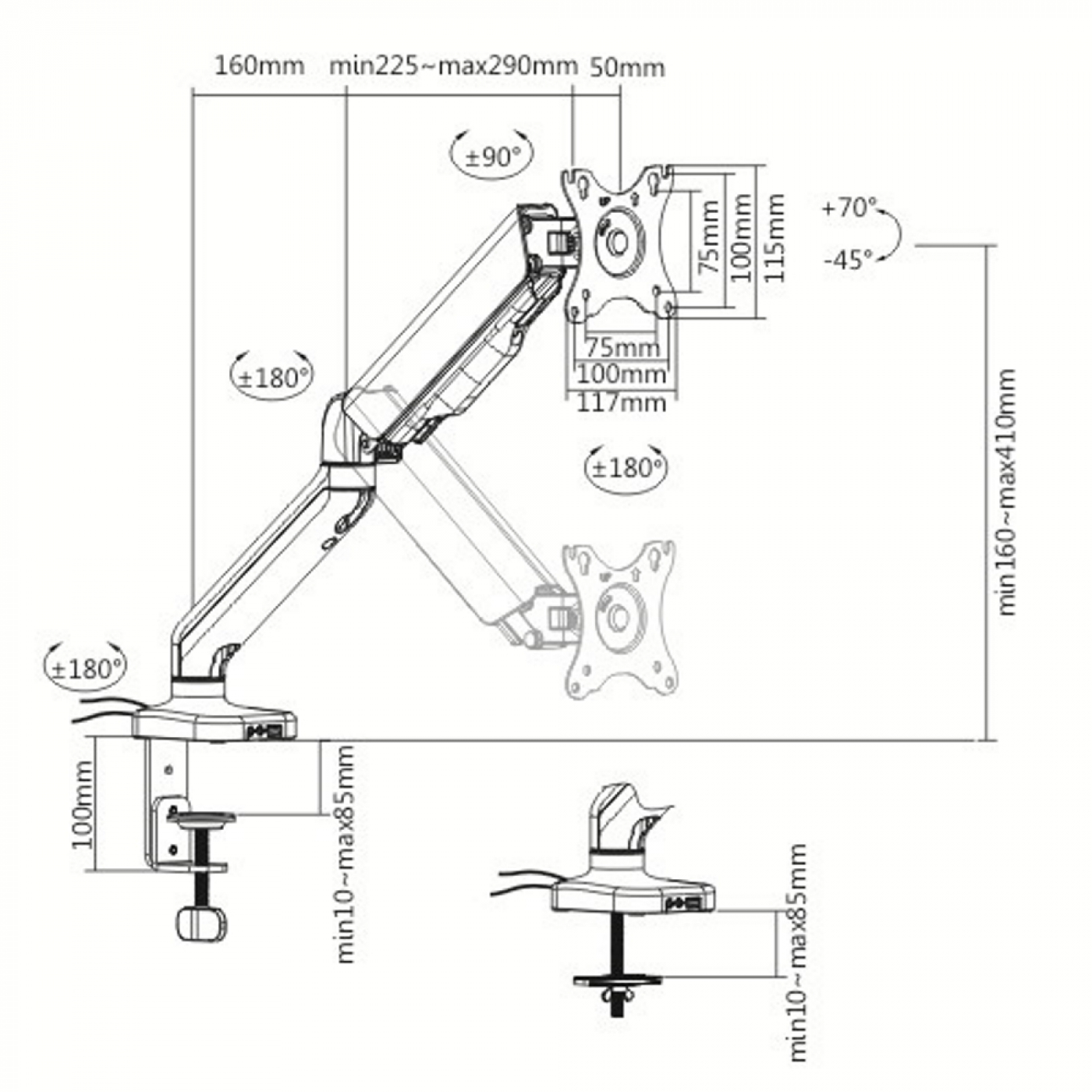 Robust in der Optik und robust in der Leistung, das ist diese Monitorhalterung mit Gasfedermechanismus für 1 Bildschirm. Mit einem integrierten USB 2.0-Port und 2 Multimedia-Ports am Monitorarm war das Aufladen von Datenübertragungen und die Verwendung von Kopfhörern noch nie so einfach! Der hochwertige Gasfedermechanismus mit eingebautem Federspannungsmesser ermöglicht mit einem Finger einfache Bewegungen des Monitorarms einschließlich Auf-Ab-Ausfahren und Einfahren, um die absolut beste ergonomische Position zu erreichen. Die praktische VESA-Platte mit Schlüssellochschlitzen ermöglicht eine schnelle Montage oder Demontage. Tischklemme und Durchgangsloch-Tüllenhalterungen sind im Lieferumfang enthalten. Der solide aufklappbare Monitorarm lässt sich um 70 Grad nach oben und 45 Grad nach unten neigen, um 180 Grad schwenken und um 360 Grad drehen. Der Bildschirm kann sowohl horizontal als auch vertikal verwendet werden. Das Kabelmanagement verbirgt elegant alle am Display befestigten Kabel. Ein drehbarer Arm bietet maximale Sichtflexibilität und die frei höhenverstellbaren Optionen ermöglichen Ihnen eine optimale ergonomische Position hinter dem Bildschirm. Geeignet für Bildschirme von 17 Zoll bis 32 Zoll. Vesa kompatibel mit 75 x 75 und 100 x 100. Das maximale Gewicht pro Monitor beträgt 9 kg.