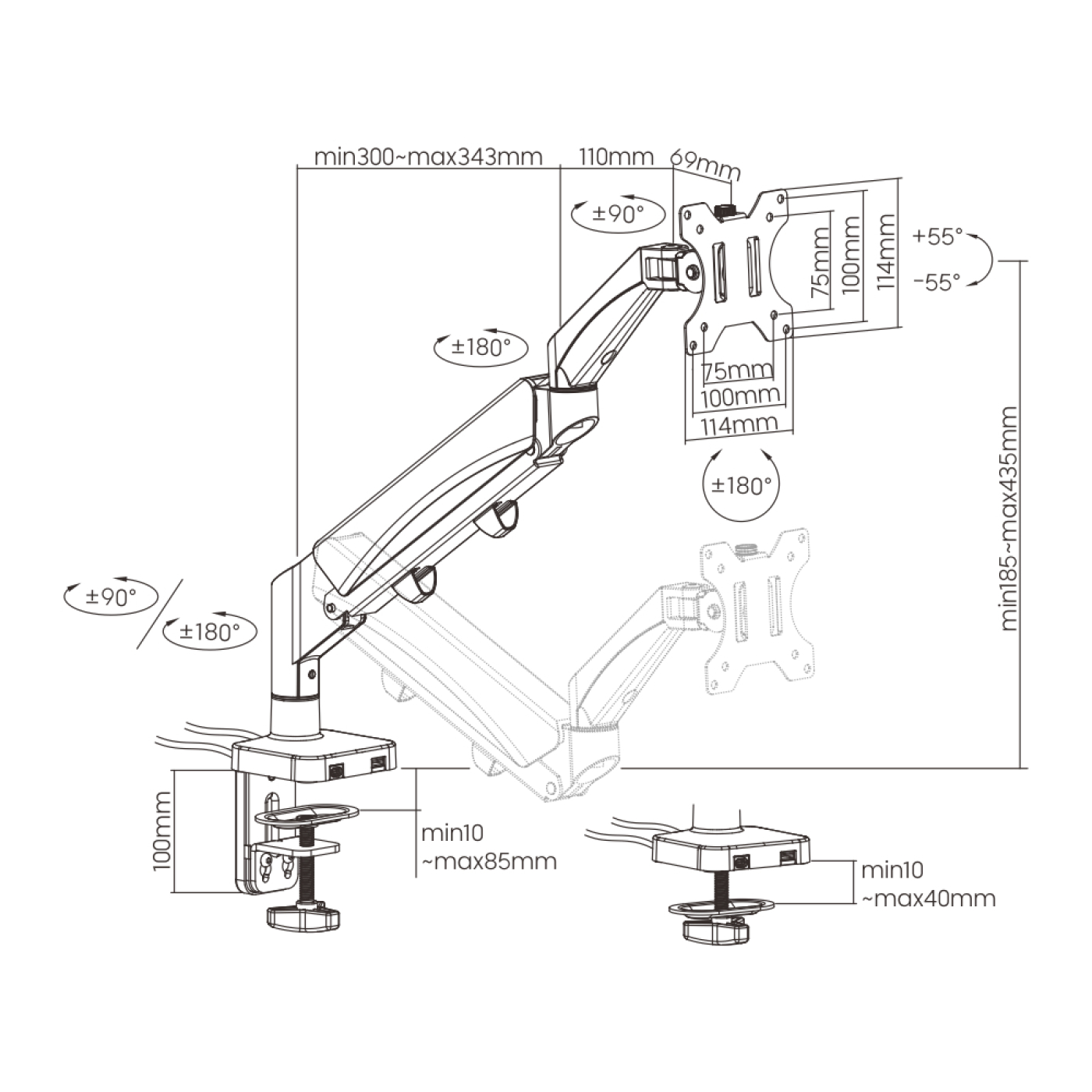 Schön im Aussehen und robust in der Leistung, das ist diese Monitorhalterung mit Gasfedermechanismus für 1 Monitor. Mit einem integrierten USB 3.0-Anschluss und einem Typ-C-Anschluss am Monitorarm war die Datenübertragung und das Aufladen noch nie so einfach! Der hochwertige Gasfedermechanismus mit eingebautem Federspannungsmesser ermöglicht mit einem Finger einfache Monitor-Armbewegungen wie Auf – Ab – Ausfahren und Einziehen, um die absolut beste ergonomische Position zu erreichen. Die praktische VESA-Platte mit Schlüssellochschlitzen ermöglicht eine schnelle Montage oder Demontage. Tischklemme und Durchgangslochbefestigung sind im Lieferumfang enthalten. Der stabile, klappbare Monitorarm kann um 55 Grad nach oben und 55 Grad nach unten geneigt, um 90 Grad gedreht und um 360 Grad geschwenkt werden. Der Monitor kann sowohl horizontal als auch vertikal verwendet werden. Das Kabelmanagement verbirgt auf elegante Weise alle am Monitor angeschlossenen Kabel. Ein schwenkbarer Arm bietet maximale Flexibilität bei der Betrachtung und die frei einstellbaren Optionen ermöglichen eine optimale ergonomische Position hinter dem Monitor. Geeignet für Monitore von 17 Zoll bis 32 Zoll. Vesa ist kompatibel mit 75 x 75 und 100 x 100. Das maximale Gewicht pro Monitor beträgt 9 kg.