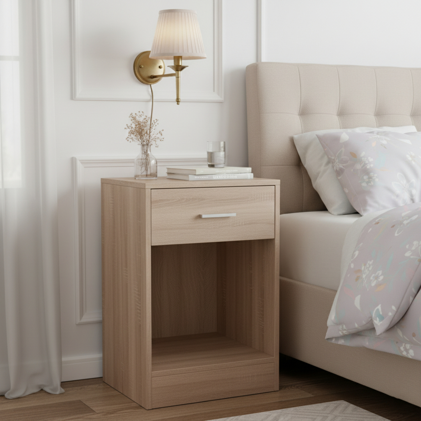 Dieser hellbraune Nachttisch/Beistelltisch verbindet ein schlichtes Design mit cleverem Stauraum. Oben befindet sich eine Schublade für kleinere Gegenstände, darunter ein großes offenes Fach für Bücher, Körbe oder Accessoires. Die 40 × 38 cm große Ablagefläche bietet Platz für alles, was Sie schnell zur Hand haben möchten. Geeignet als Nachttisch im Schlafzimmer, aber auch ideal im Wohnzimmer, Flur oder Arbeitszimmer.