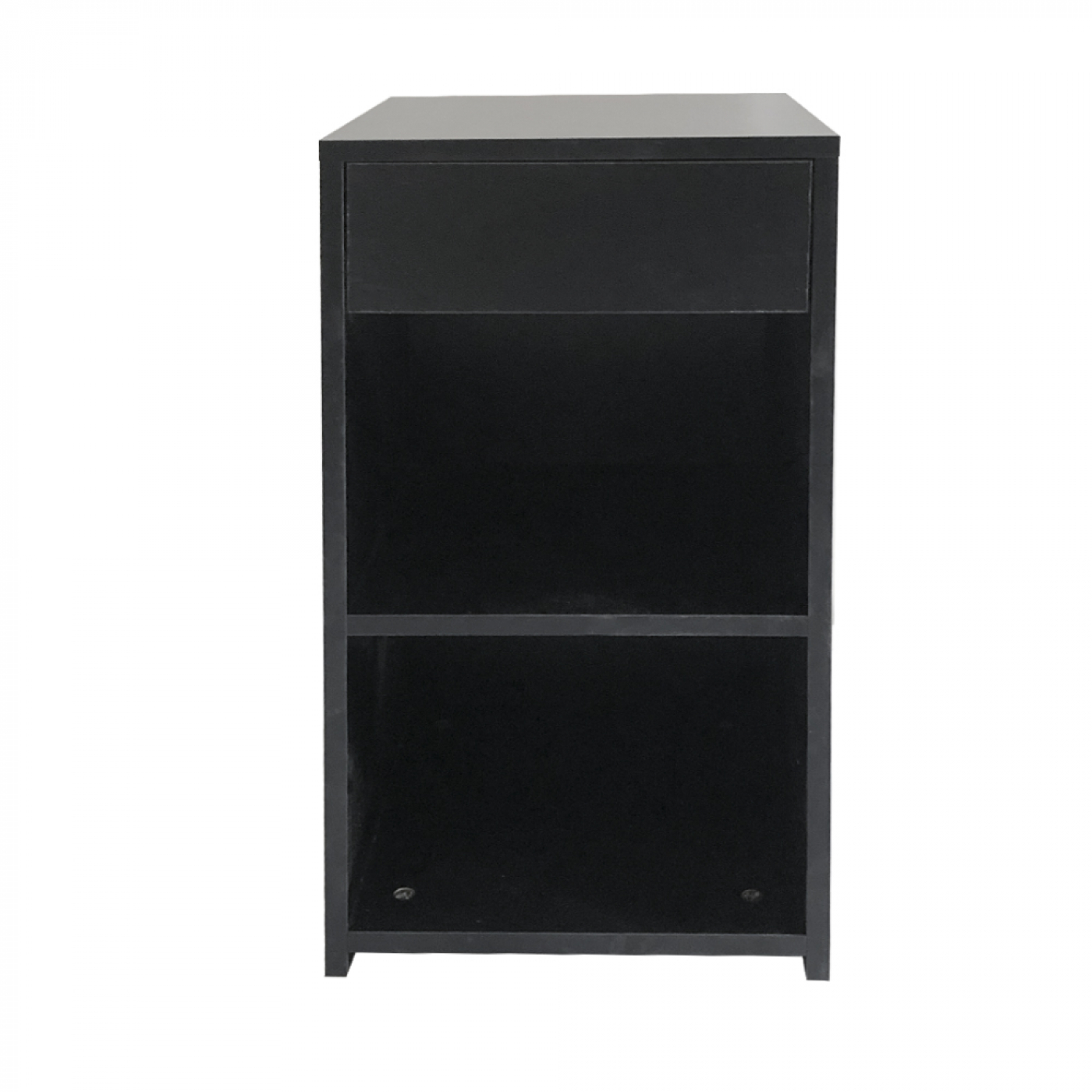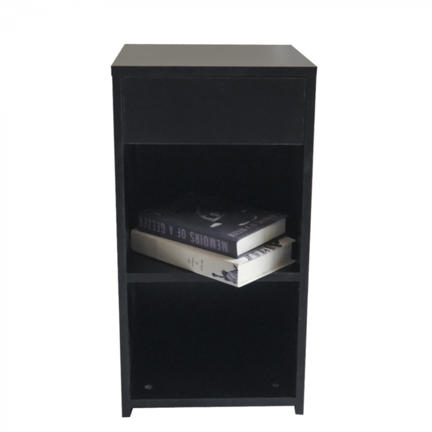 Ein schlichtes und modernes Design in einer schlichten, aber funktionalen Version, dieser schwarze Nachttisch, produziert in einer erschwinglichen Budget-Qualität, hat es in sich. Dieser 65 cm hohe Schrank bietet in den 2 offenen Fächern und der Schublade genügend Möglichkeiten, um Ihre Sachen zu verstauen und auf der oberen Tischplatte mit den Maßen von 35 cm x 35 cm findet alles, was Sie schnell griffbereit haben möchten. Natürlich können Sie den Schrank nicht nur als Nachttisch im Schlafzimmer verwenden, sondern eignet sich auch für Wohnzimmer, Flur oder Büro. Maße: 35 cm breit, 35 cm tief und 65 cm hoch. Mit der mitgelieferten Montageanleitung und dem Montagematerial lässt sich die Box schnell und einfach montieren.