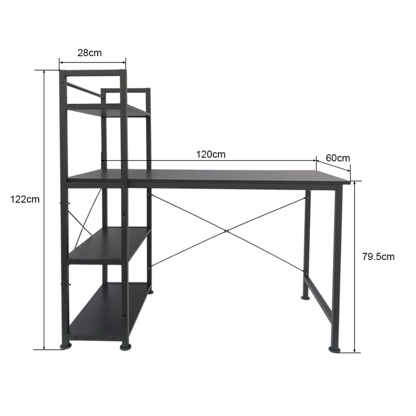 Ein funktional robustes und stabiles industrielles Vintage-Schreibtischmöbel mit einem schwarzen Metallrahmen und einer schwarzen Holztischplatte von 120 cm Breite. Aufgrund des Designs einer Metallkonstruktion von 122 cm Höhe stehen 3 zusätzliche Ablageflächen von 28 cm Breite und 60 cm Tiefe zur Verfügung, um Ihren PC-Desktop, Ihre Druckerdateien oder andere Gegenstände zu platzieren, die Sie schnell zur Hand haben möchten. Perfekt als Computertisch in Ihrem Büro, Arbeitszimmer, Wohnzimmer, Arbeitszimmer oder Schlafzimmer. Die Maße dieses Tisches sind 120 cm breit x 60 cm tief x 79 cm hoch bis Tischplatte und links bis zur höchsten Halterung 122 cm. Lieferung inkl. Montageanleitung und benötigtem Material.