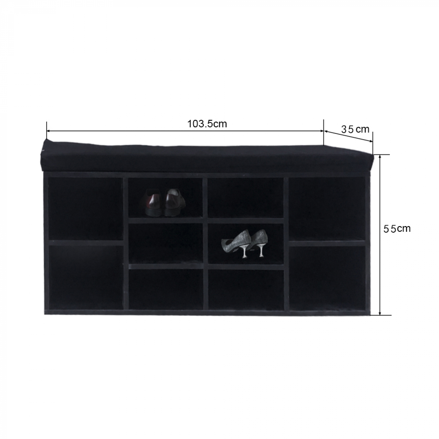 Sie suchen eine praktische und platzsparende Lösung zur Aufbewahrung Ihrer Schuhe? Dieser schwarze Schuhschrank mit 10 offenen Fächern und einem bequemen Sitzkissen kann auch als Bank verwendet werden. Ideal geeignet für die Platzierung in Ihrem Flur, Kinderzimmer, Schlafzimmer, Hauswirtschaftsraum, Garage oder Empfangsraum. Natürlich können Sie diesen offenen Schrank oder diese Bank auch zur Aufbewahrung vieler anderer Gegenstände oder als zusätzliche Sitzgelegenheit im Kinderzimmer, Schlafzimmer, in der Küche oder im Wohnzimmer verwenden. Abmessungen: 103,5 cm breit, 35 cm tief und 55 cm hoch. Mit der mitgelieferten Montageanleitung und Montagematerial lässt sich die Box schnell und einfach montieren.