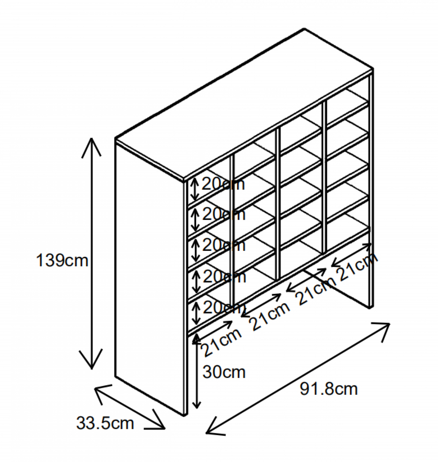 Dieser Schuhschrank in der Farbe braune Holzstruktur ist eine Variante des Schuhschranks L und verfügt über 20 Ablagefächer für unter anderem die Aufbewahrung von Schuhen und ist so konzipiert, dass zusätzlicher Stauraum auf dem Boden entsteht B. für hohe Schuhe und/oder Stiefel oder für zusätzliche Körbe zur Aufbewahrung anderer Gegenstände. Dieser Schuhschrank hat ein stilvolles, aber auch sehr funktionales Design und ist daher eine optimale Aufbewahrungslösung für unter anderem Ihr Flurschlafzimmer sowie Ihren Abstellraum oder Schuppen. Bis zu ca. 20 Paar Schuhe finden in den 20 offenen Fächern am Boden Platz, zusätzlichen Stauraum schaffen Sie nach Belieben. Dieser Schuhschrank lässt sich auch mit mehreren Schränken nebeneinander zu einem großen Aufbewahrungsschrank kombinieren. Schrankabmessungen: hoch 139 cm x breit 108 cm x tief 33 cm. Maße der Fächer: hoch 20 cm x breit 25 cm x tief 33 cm. Maße des unteren Stauraums: hoch 30 cm x breit 108 cm x tief 33 cm. Farbe: braune Holzstruktur. Lieferung inkl. Montageanleitung und benötigtem Material.
