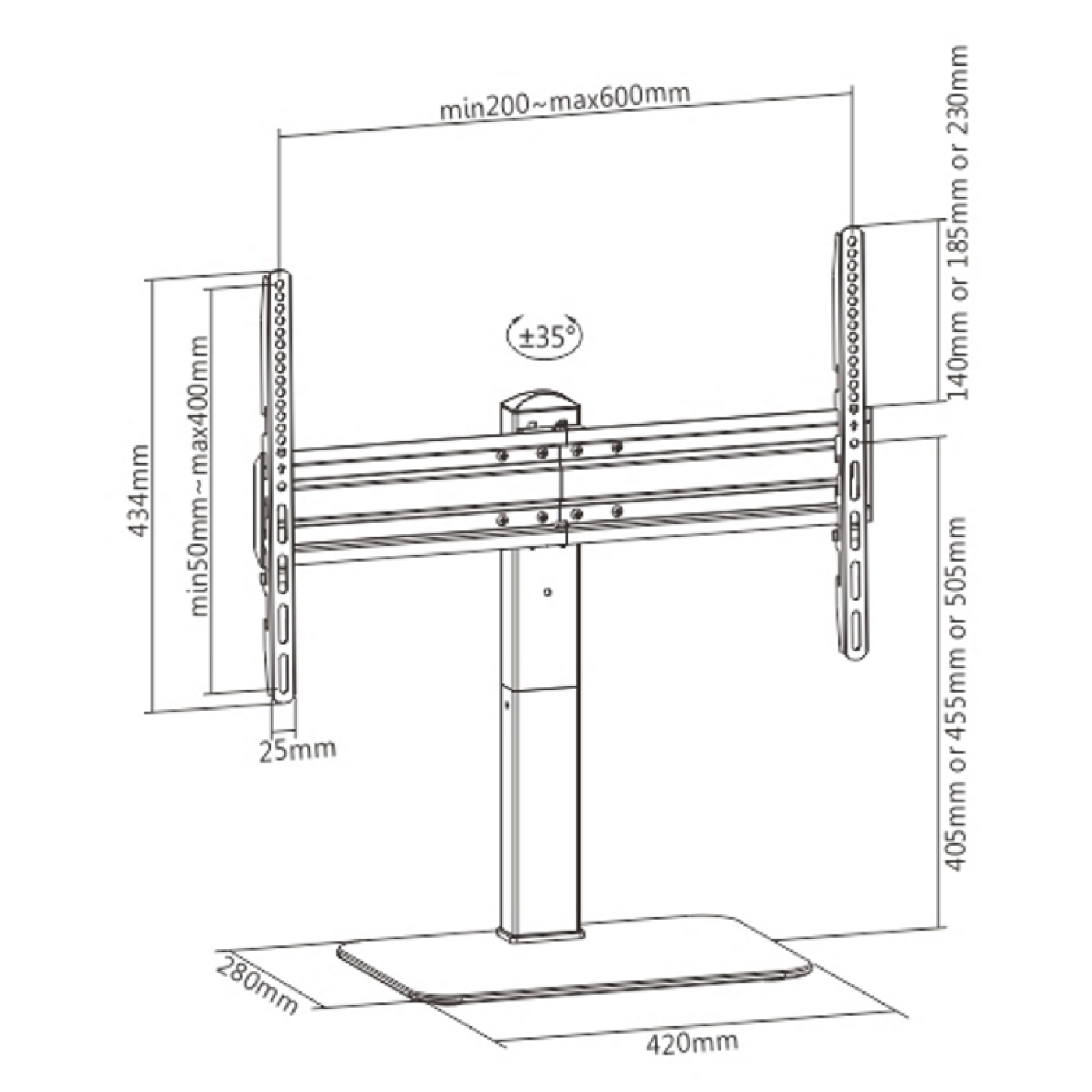 Ein preisgünstiger und dennoch langlebiger, stabiler und formschöner Stand-TV-Ständer für die TV-Montage aus Metall und einer Basis aus 8 mm starkem, massivem Sicherheitsglas. Abgesehen von der robusten Struktur und dem gut gestalteten Erscheinungsbild kann der Fernseher standardmäßig um 35 Grad nach links und 35 Grad nach rechts gedreht werden. Dieses Fernseh-Standardstativ ist an der Säule manuell höhenverstellbar von 35 cm bis 55 cm (siehe Bild). Das Kabelsystem verbirgt elegant alle an Displays angeschlossenen Kabel. Möglichkeit, den Fernseher oder Bildschirm kontinuierlich für einen optimalen Betrachtungswinkel zu drehen. Passend für die meisten Bildschirme von 37 Zoll bis 70 Zoll. Vesa-kompatibel mit 200×200 300×200 300×300 400×200 400×300 400×400 und 600×400. Maximales Gewicht des Bildschirms 40 kg. Lieferung inkl. Montageanleitung und benötigtem Material.