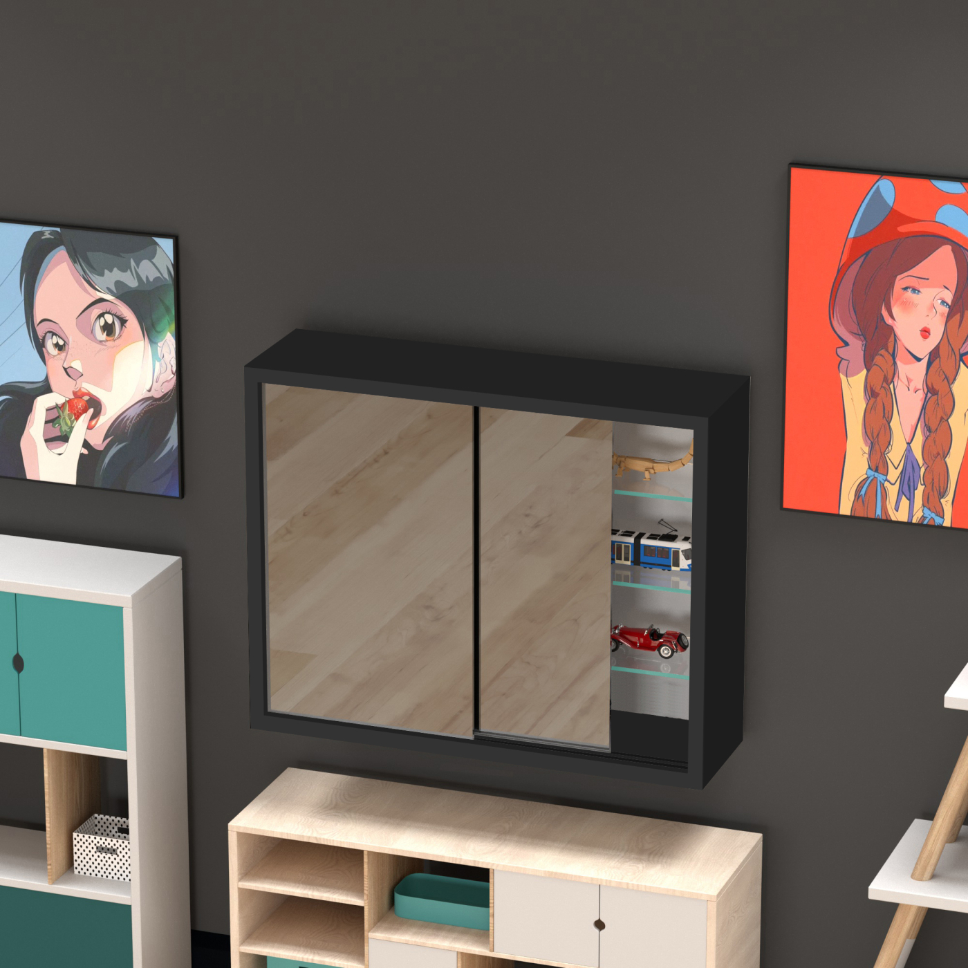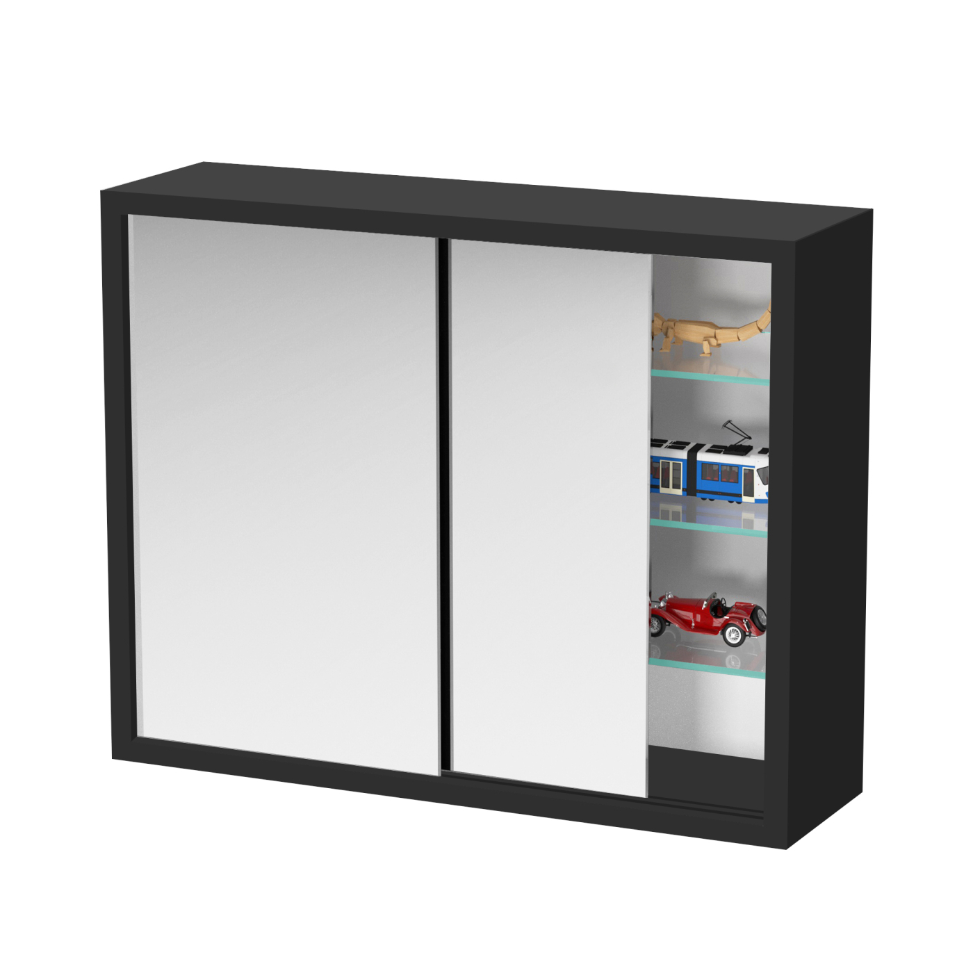 – Schwarzer Spiegelschrank mit Schiebetüren.