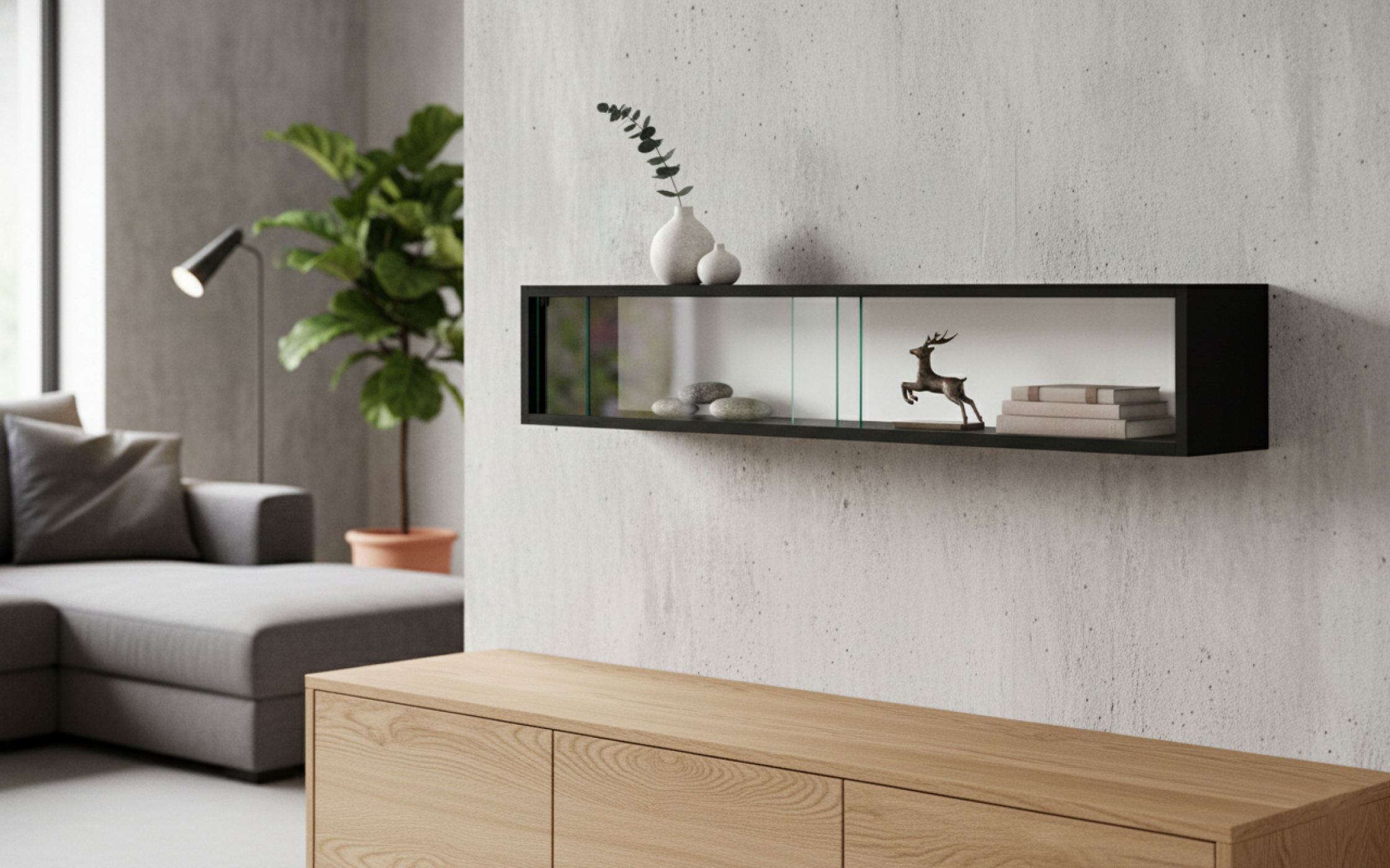 Lange Vitrine 95 cm breit mit Schiebetüren aus Sicherheitsglas – hängend oder stehend verwendbar